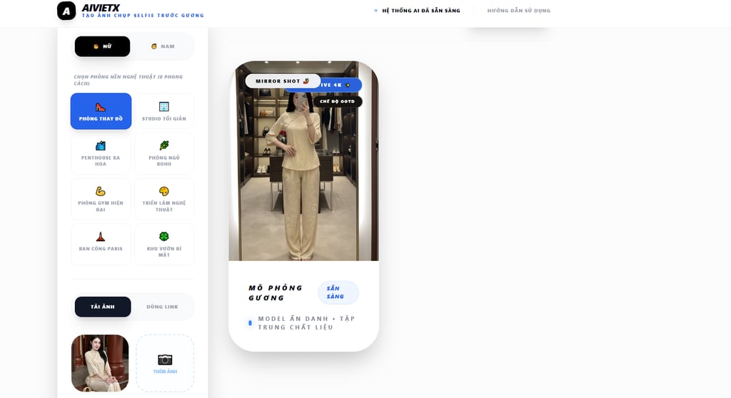 AIVIETX vừa cập nhật và tối ưu công cụ tạo ảnh selfie trước gương từ ảnh sản phẩm, tập trung mạnh hơn cho shop thời trang và người làm video Affiliate TikTok / Shopee / Facebook.